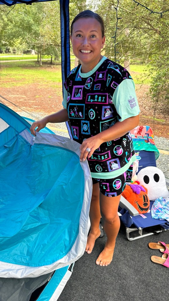Once at my Fort Wilderness campsite, my heart raced with a mix of eagerness and uncertainty. Would I be able to set up the tent properly? What if I didn’t like it? These thoughts danced through my mind as I parked and unloaded my supplies. With determination and a helpful set of instructions, I began setting up my tent. The process was surprisingly straightforward and my Villey easy popup tent erected itself once out of the bag. I also unpacked a couple of chairs, pillows, blankets, a tarp for ground cover, an Intex Queen inflatable mattress, a cooler, a small fan, and a 10×10 canopy tent to cover the space since Florida is known for rain. With each addition to making camp, I grew more confident this would be a great experience.